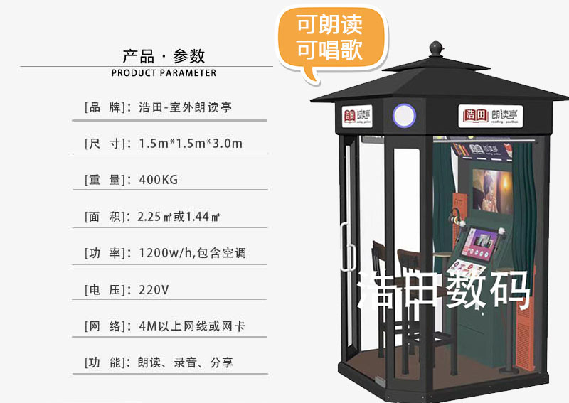 朗讀亭伴隨著央視中央電視臺(tái)開(kāi)年力作,大型文化情感節(jié)目《朗讀者》的籌劃應(yīng)運(yùn)而生、朗讀亭外觀古樸、比普通的電話亭要稍微略大一些,上面寫(xiě)著大大的“朗讀亭”字樣,24小時(shí)開(kāi)放。內(nèi)部工作臺(tái)、電源、燈飾、插座及一套完整的錄音設(shè)備。廣州浩田為客戶提供室外朗讀亭加盟渠道,為您解答朗讀亭價(jià)格費(fèi)用、朗讀亭免費(fèi)使用嗎、室外朗讀亭怎么使用等問(wèn)題。