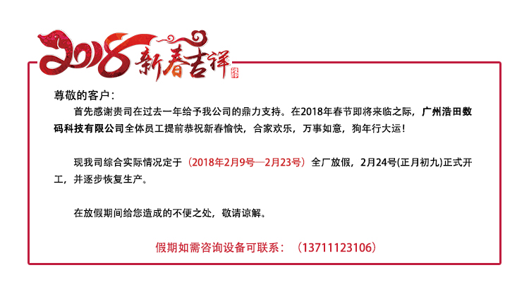 首先感謝貴司在過去一年給予我公司的鼎力支持。在2018年春節即將來臨之際,廣州浩田數碼科技有限公司全體員工提前恭祝新春愉快,合家歡樂,萬事如意,狗年行大運! 現我司綜合實際情況定于2018年2月9號(十二月二十三)至2月23號(正月初八)全廠放假,2月24號(正月初九)正式開工,并逐步恢復生產。