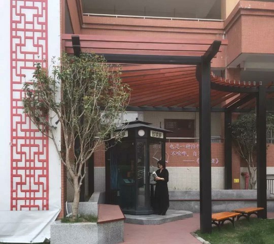 朗讀亭,座落在學校科學樓前的東邊草坪邊上,外形似復古電話亭,溫暖大氣,讓人神往。它占地約2平方米,可謂麻雀雖小五臟俱全——專業的音響系統、電子屏幕、氛圍燈光一應俱全,系統自帶大量的數字朗讀資源:每學期必讀書籍中的某些篇章或古詩詞,語文教材中的某篇課文及節選,以及教育部推薦的網絡閱讀平臺中的中華經典等多種類型的書目供選擇。每位朗讀者進門后對著麥克風就可以開始朗讀自己心目中的好文章。