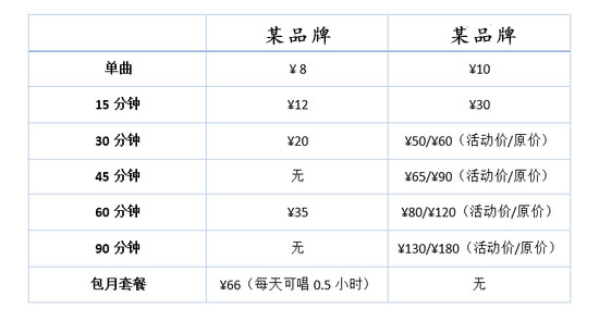 北京地區部分單曲收費8元,15分鐘收費20元、30分鐘38元、60分鐘58元。也有單曲收費為8元,分時段收費15分鐘為25元、28分鐘36元、38分鐘42元、48分鐘48元、58分鐘55元。